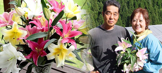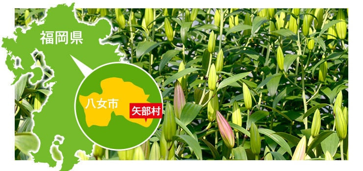 当店の百合は福岡県八女市矢部村、標高400~800mの、猫の額のような小さな土地で栽培しています。夏は涼しいので、全国で百合の出荷本数が少なくなる夏場でも矢部村では栽培に適しています。